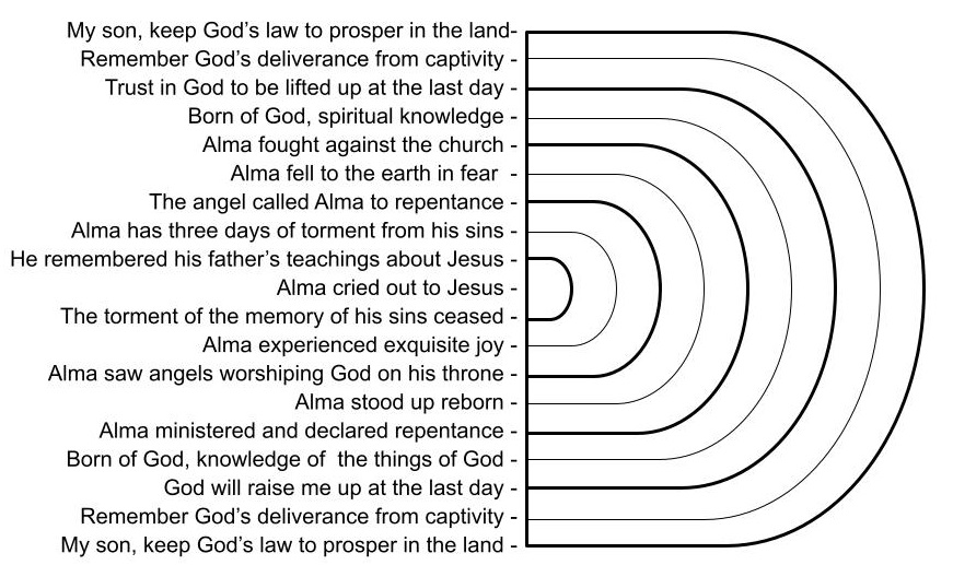 The above figure is my own chiasmus breakdown of Alma chapter 36. A chiasmus is a poem where the beginning is paired with the end often moving inward towards a central climax or point of transformation. Nearly half a century ago, John W. Welch first pioneered the study of chiasmus in the Book of Mormon including his published analysis of Alma Chapter 36. His publication along with other chiasmus examples from ancient scripture can be downloaded here.